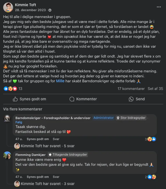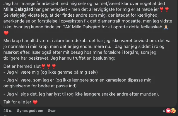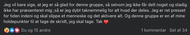 Du kan være anonym, og du er aldrig forpligtet til at dele, bare være med i det tempo, der føles rigtigt for dig. Den største udvikling, ligger ofte blandt ligesindede.